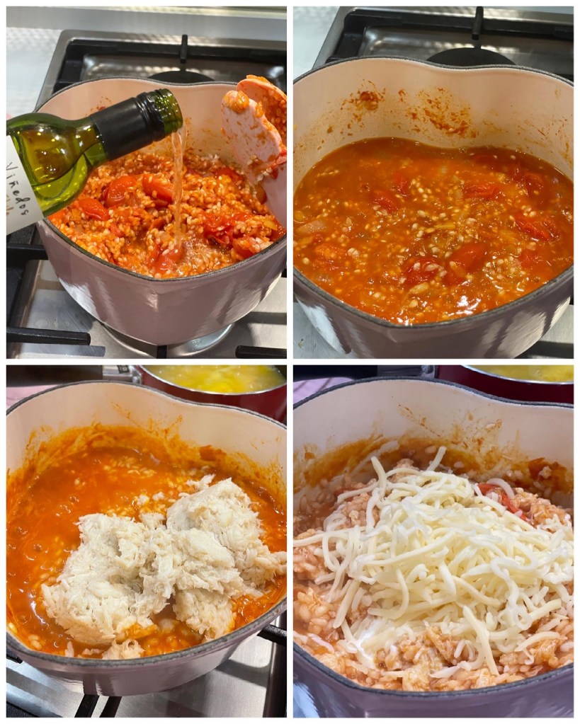 3) 加入白酒煮1分鐘,轉細火,分數次加入fish stock,每次收水後再加入高湯,煮15分鐘!最後5分鐘加入蟹肉!or直到飯煮至al dente熟(約20分鐘,可自己試下先)