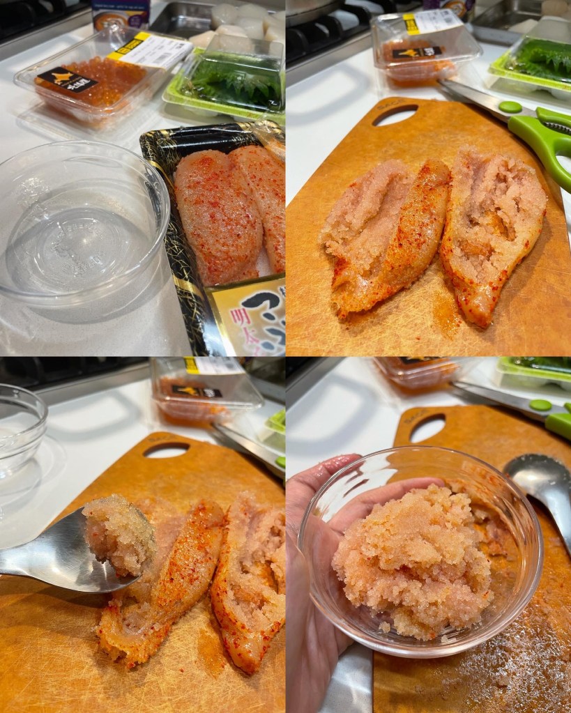 4) 明太子去衣把中間的明太子拿出來!鍋中加入明太子、牛油、淡忌廉和醬油,小火煮滾