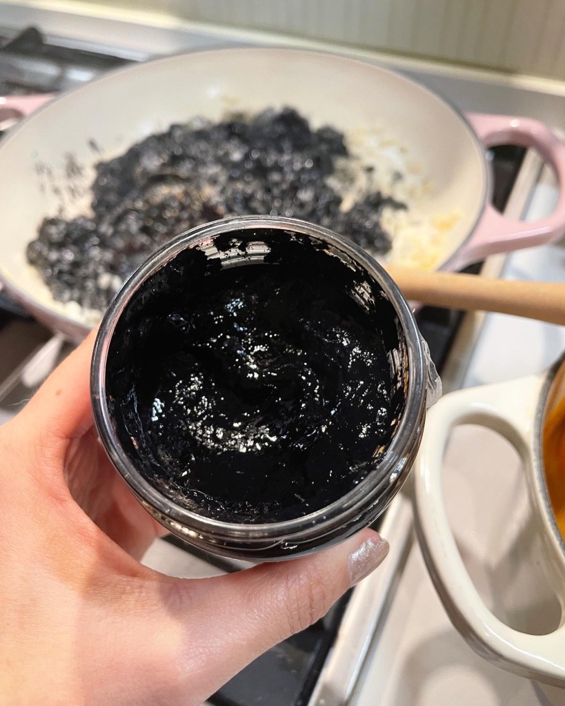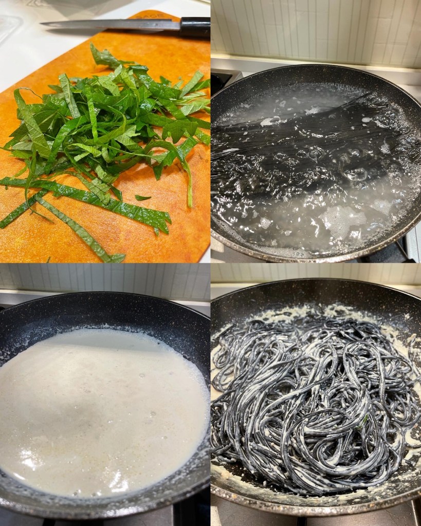 3) 下忌廉、墨汁、鹽和黑椒拌勻再煮5分鐘