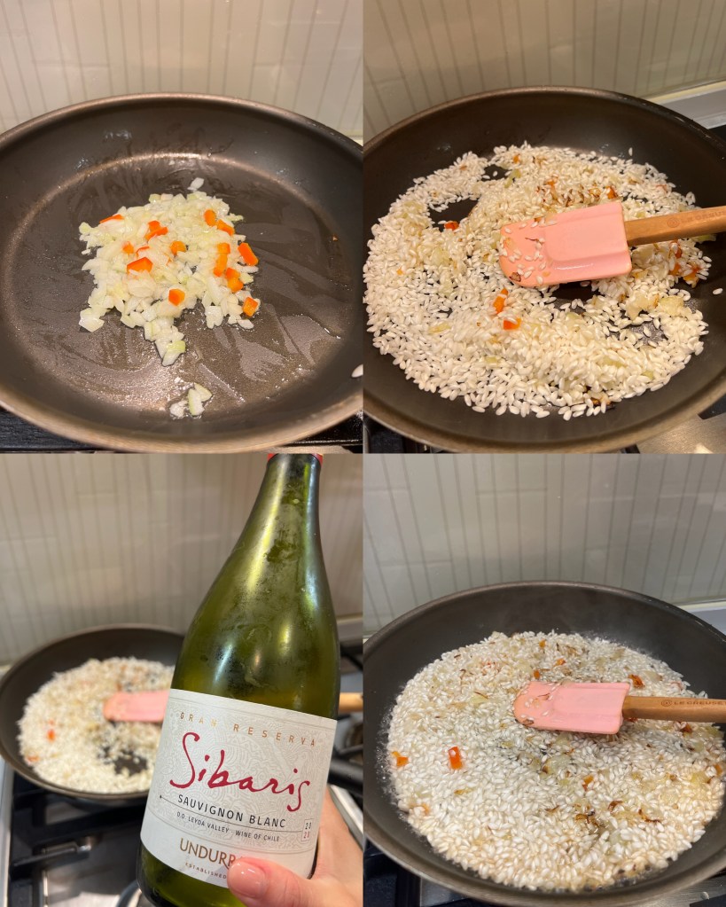1) 牛油加少許橄欖油細火煮溶,下洋蔥碎和紅椒碎炒約1分鐘!再加入米炒1分鐘至每粒米都包上汁