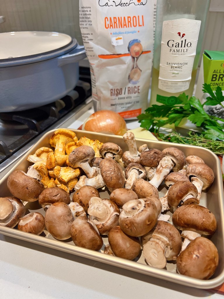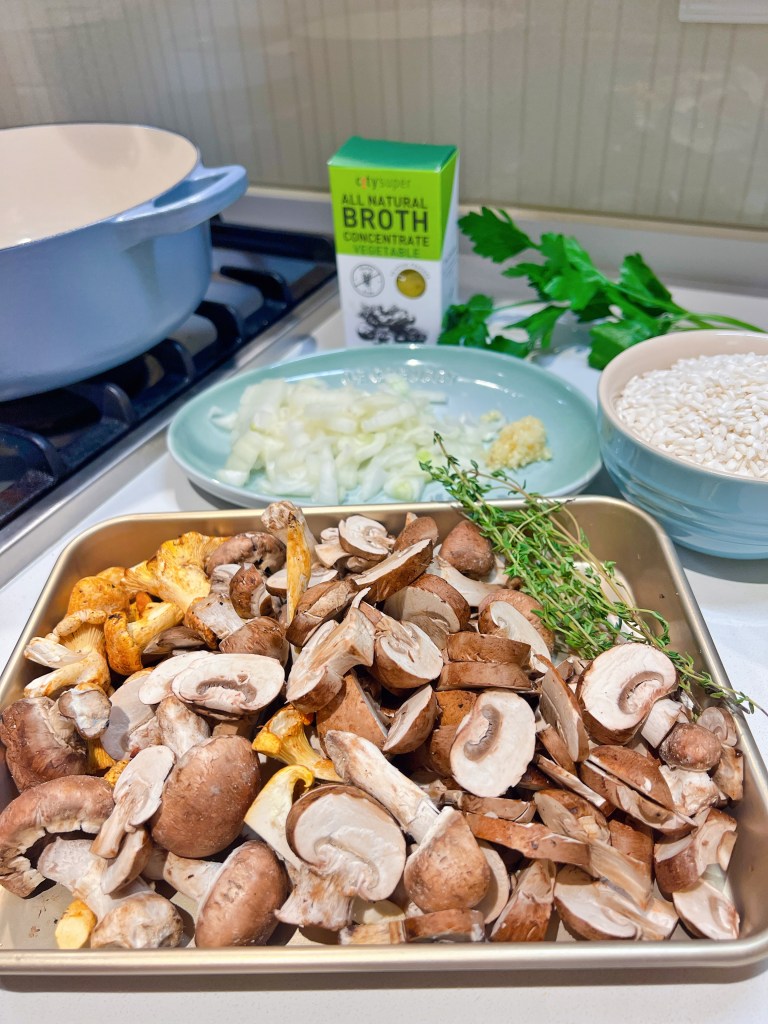 2) 用牛油及橄欖油起鑊,爆香洋葱碎和蒜蓉,中火加入菇類炒約3分鐘到軟身,下意大利米炒1分鐘至每粒米都包上油