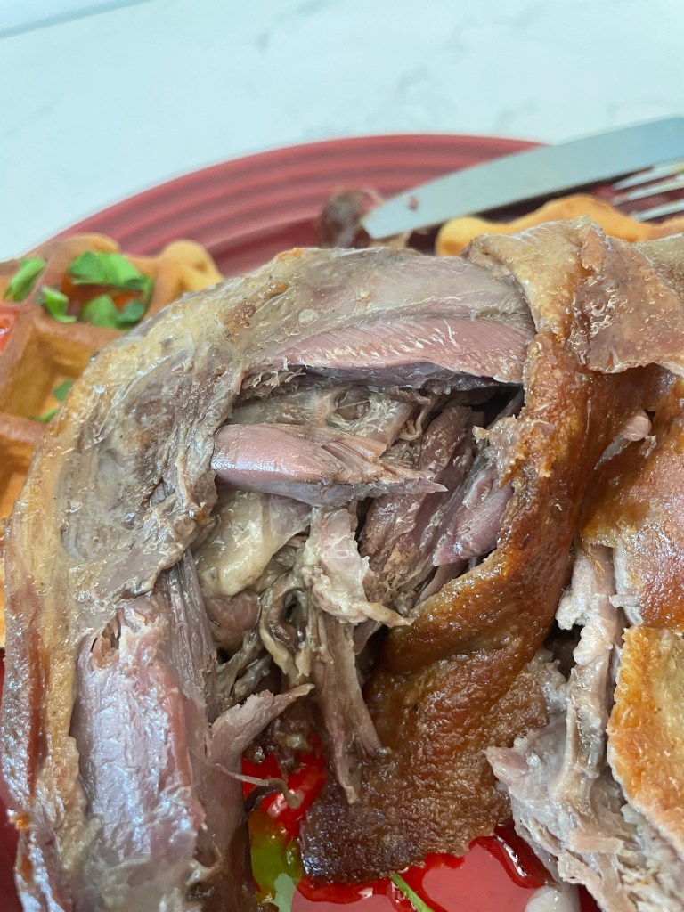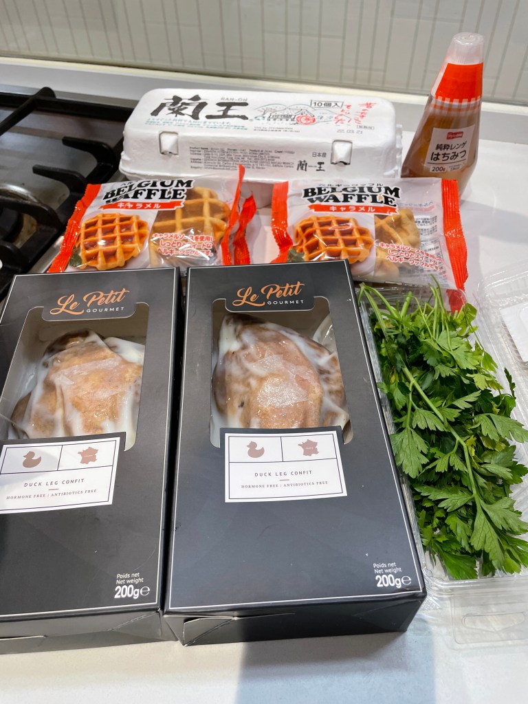 Inspired by duck & waffle obviously! 成件事係Lazy Sunday Brunch version😗全部都係現成材料,但係效果都好正♥️鴨腿用咗一隻急凍法國油封鴨腿!向Apita買$99🤣就咁解凍後煎到2面脆身就OK✔️本身有好多鴨油,所以油都唔駛落🦆幾好食肉質唔錯♥️waffle都係用現成焗返熱佢😚鴨蛋就無跟到,用咗蘭王蛋,就咁用油煎就OK😋最後倒上糖漿🍯