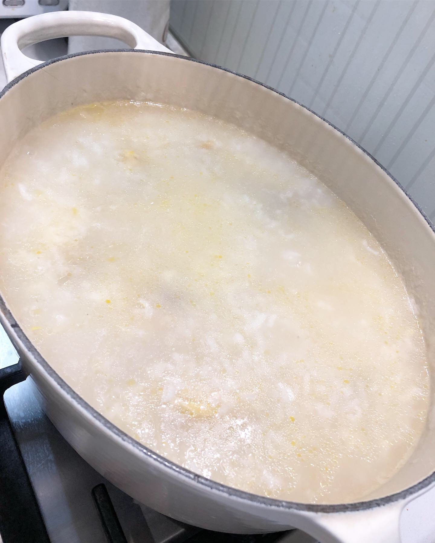 4) 加入黃姜粉、咖喱粉、椰漿、白酒和水小火煮15分鐘,加入蘿蔔、薯仔、鹽和黑胡椒煮2分鐘至汁稠