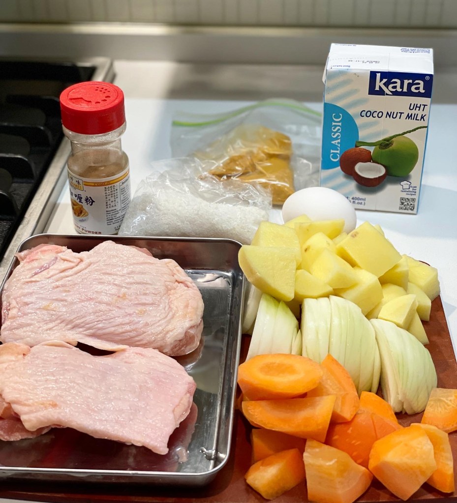 2) 雞腿肉切塊,加入醃料醃最少30分鐘,洋蔥切塊