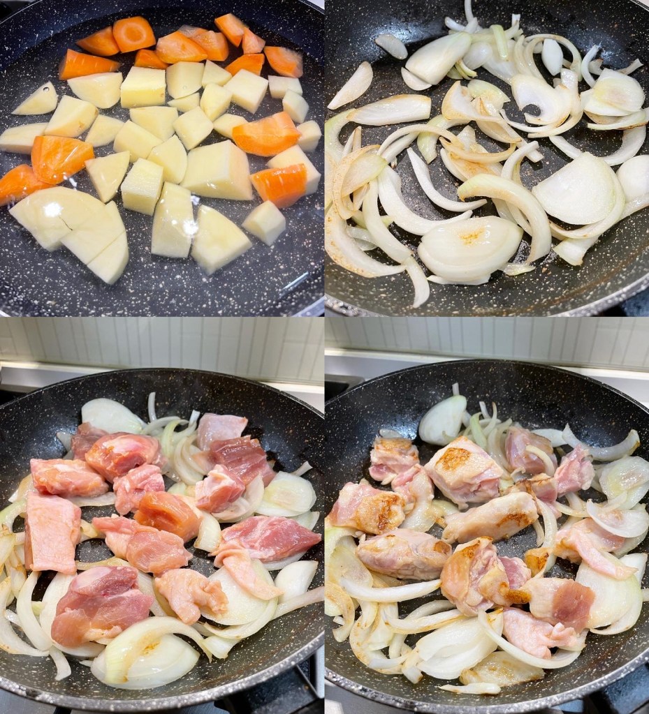 3) 鍋內中火先加入洋蔥炒香,再加入雞腿肉略炒